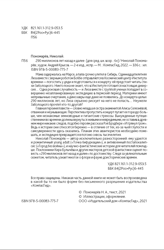 Николай Пономарёв - автор исключительно разносторонний: ему удаются и романтичный young adult ("Точка бифуркации"), и антивоенный постапокалипсис ("Город без войны"), и научно-фантастические истории для читателей помладше. Поклонники Кира Булычёва и других мастеров детской фантастики оценят повесть "290 миллионов лет назад и далее" по достоинству. Следя за увлекательным сюжетом, читатель узнает многое о флоре и фауне доисторических времен.