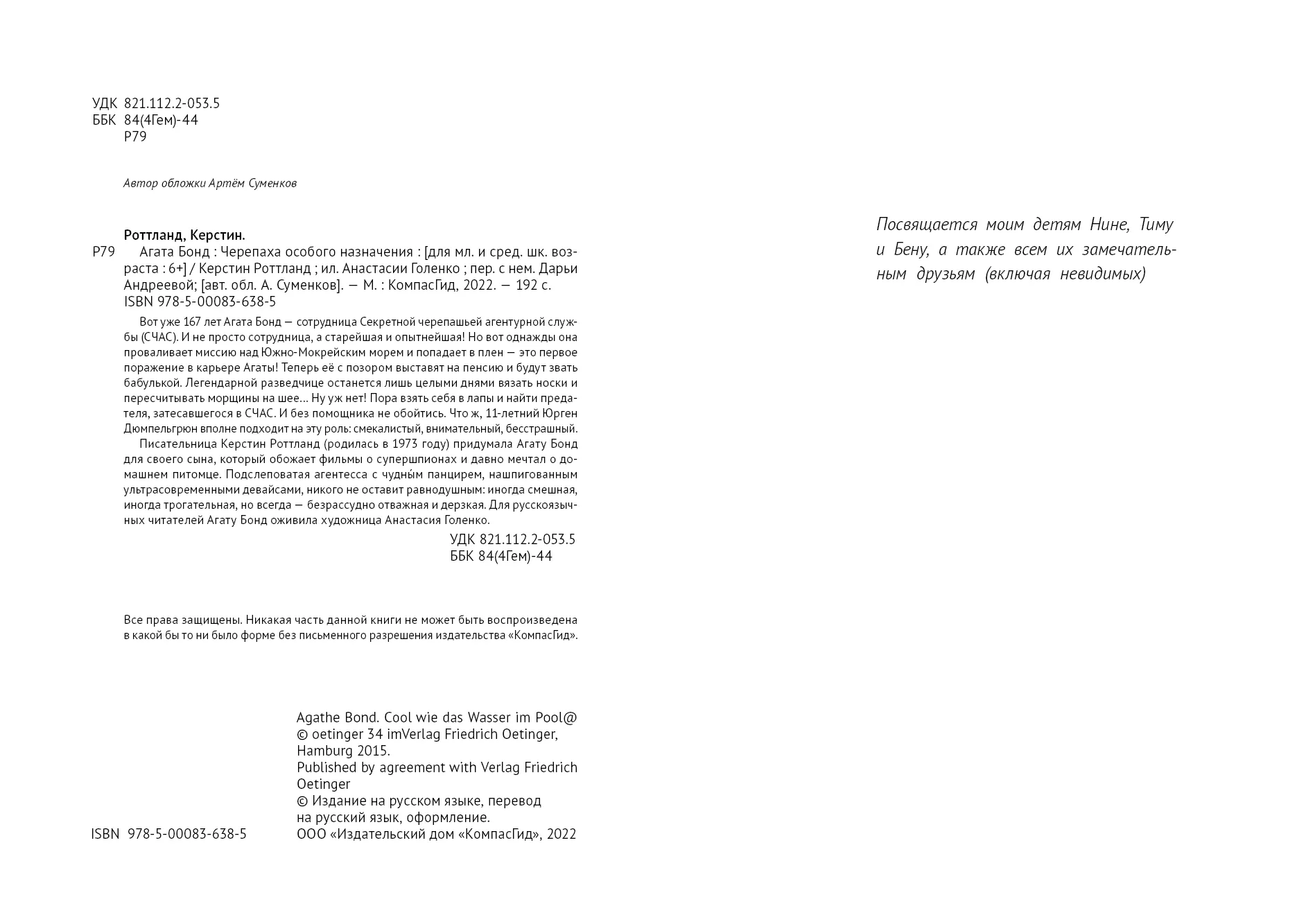 Писательница Керстин Роттланд (родилась в 1973 году) придумала Агату Бонд для своего сына, который обожает фильмы о супершпионах и давно мечтал о домашнем питомце. Подслеповатая агентесса с чудным панцирем, нашпигованным ультрасовременными девайсами, никого не оставит равнодушным: иногда смешная, иногда трогательная, но всегда — безрассудно отважная и дерзкая. Для русскоязычных читателей Агату Бонд оживила художница Анастасия Голенко.