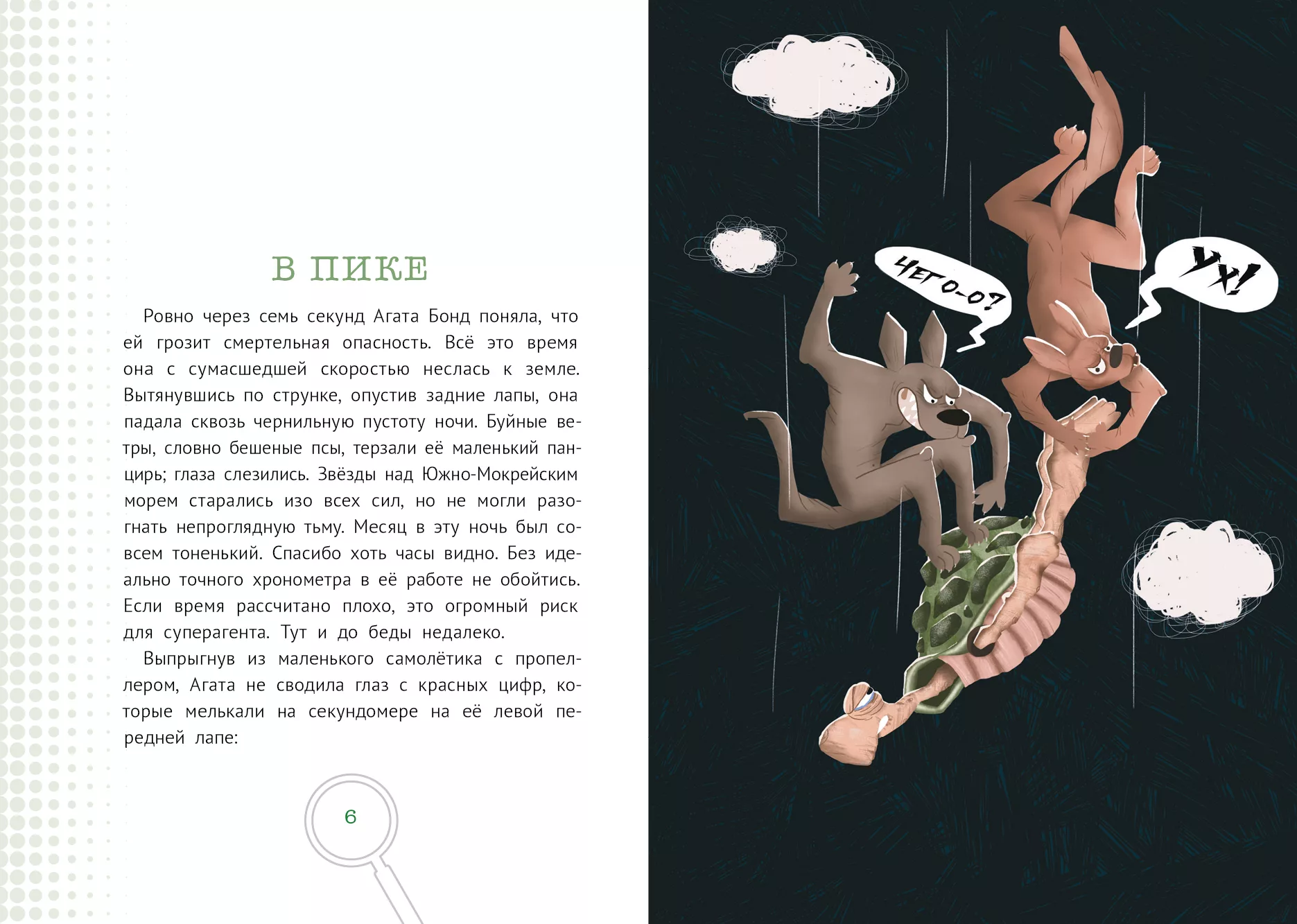 Вот уже 167 лет Агата Бонд — сотрудница Секретной черепашьей агентурной службы (СЧАС). И не просто сотрудница, а старейшая и опытнейшая! Но вот однажды она проваливает миссию над Южно-Мокрейским морем и попадает в плен — это первое поражение в карьере Агаты! Теперь её с позором выставят на пенсию и будут звать бабулькой. Легендарной разведчице останется лишь целыми днями вязать носки и пересчитывать морщины на шее... Ну уж нет! Пора взять себя в лапы и найти предателя, затесавшегося в СЧАС. И без помощника не обойтись. Что ж, 11-летний Юрген Дюмпельгрюн вполне подходит на эту роль: смекалистый, внимательный, бесстрашный.