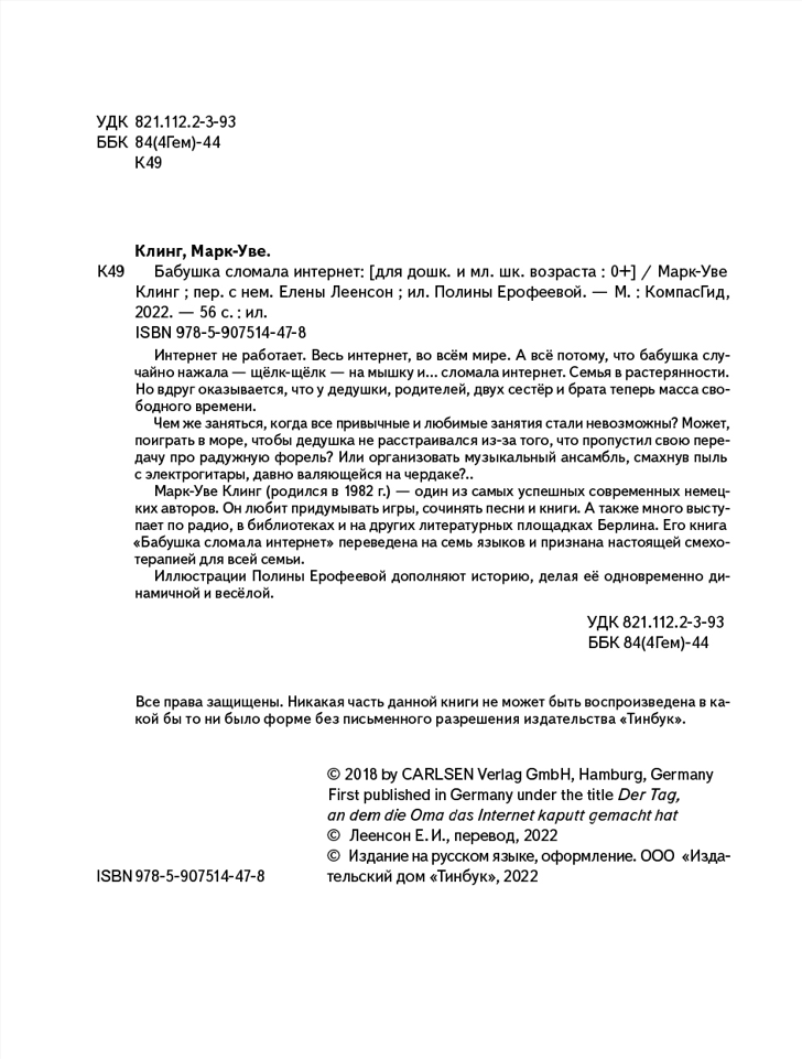 Марк-Уве Клинг один из самых успешных современных немецких авторов. Он любит придумывать игры, сочинять песни и писать книги. Недавно в издательстве «КомпасГид» вышел перевод его книги «Бабушка сломала интернет». В Европе она признана настоящей психотерапией для всей семьи.