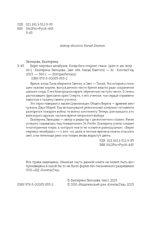 Екатерина Звонцова — автор и редактор с десятилетним стажем. Ранее успешно издавалась под псевдонимом Эл Ригби. Екатерина умело создает многогранные миры, к которым никто не остается равнодушным. «Берег мертвых незабудок» — о том, что даже в темные времена можно отыскать свет, а на пепелище рано или поздно вновь вырастут цветы.