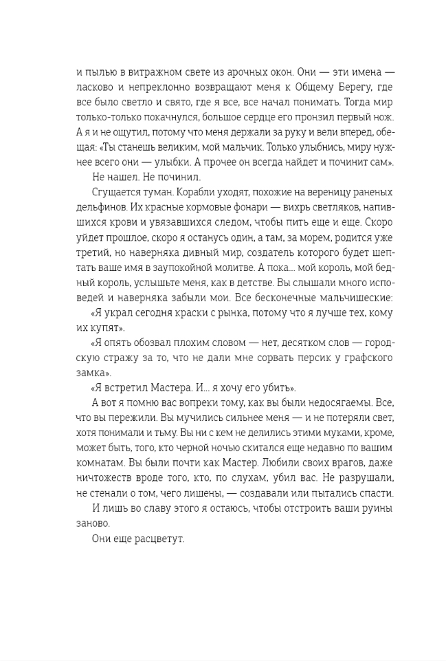 Текст книги очень плотный, напевный, если не сказать поэтичный. В перламутровой красоте порой теряешься, но нужно ловить не смыслы каждого слова, а ощущения: мозаика понимания собирается только так. «Берег мертвых незабудок» чем-то напоминает сокровищницу дракона из старых сказок – в и без того прекрасных горах золота можно найти огромные бриллианты (каждый читатель здесь – немного Бильбо Беггинс). В общем массиве текста есть абсолютно потрясающие сцены: например, как художник-мастер находит лучшего ученика и как старый король сходит с ума, требуя собирать букеты и засыпая на земле в засохших оранжереях.