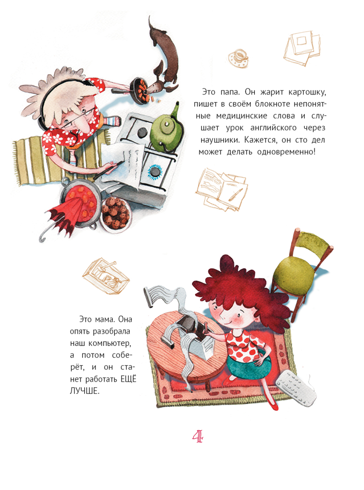 Трогательные и забавные иллюстрации Саши Ивойловой — цветные и контурные, в виде рисунков на полях, рецептов, шпаргалок, маленьких инструкций и школьных записок — прекрасно сочетаются с текстом. Отдельное удовольствие доставят читателю забавные рецепты «находчивого» дерева, тыквоперевозочного средства, создания ёлочного абажура и пирога «мишотка», список крокодильских улыбок, задачи про всё, что случилось, признаки любви, взаимосвязь невидимости и кефира и прочие очаровательные «врезки» из рассказов девочки.