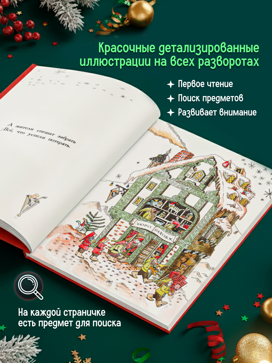 Удивительная история про маленькую деревню, в которой предметы теряются или падают с неба, а ее жители постоянно ищут свои пропажи и ремонтируют дома, пока читаешь кажется, что текст очень не связан и только в конце понимаешь что же это за деревня и почему так получается. Стихов не очень много, иногда буквально пару строчек на разворот, на каждом развороте иллюстрация, очень детальная, можно долго рассматривать, а ещё можно искать предметы, которые расположены под стихотворением. Качество печати хорошее, книга отличная, сюжет необычный, рекомендую!