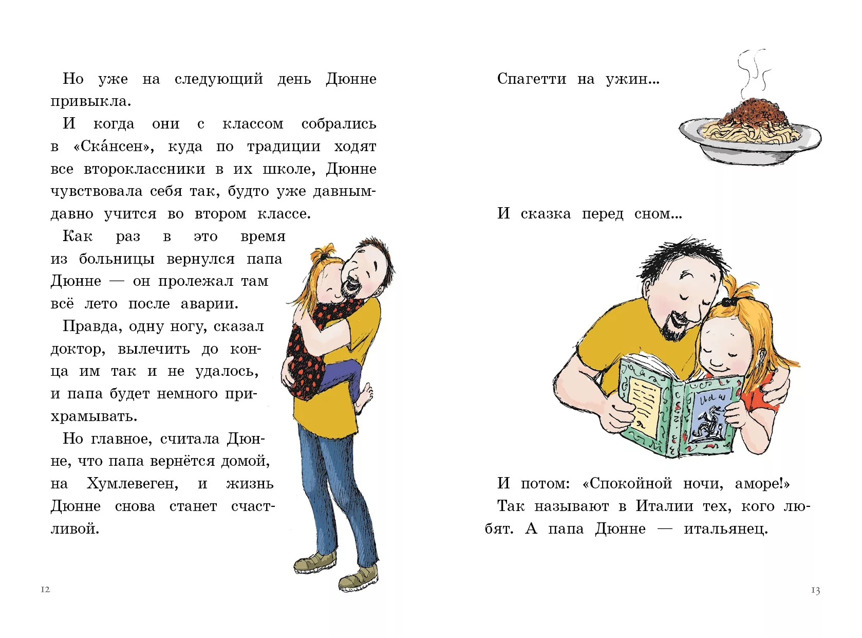 Первые летние каникулы в жизни Дюнне закончились, и она возвращается домой, в Стокгольм, к учёбе. К счастью, школа - это не одни лишь уроки: в сентябре учительница повезла второклассников в "Скансен", музей под открытым небом с большим зоопарком. Там было здорово, пока вредные Викки и Микки не обидели Дюнне - да так, что она отстала от класса и потерялась. Всё это было бы ужасно грустно, если бы не Элла-Фрида! Ведь лучшая подруга всегда оказывается именно там, где тебе нужно! Дюнне мечтает рассказать о своих приключениях папе, но вечером он, как всегда, занят своими делами: в последнее время папа думает только о своей подруге Вере…