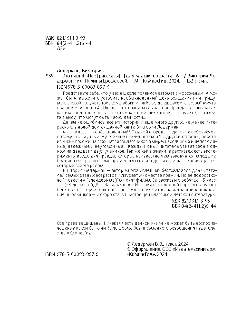 4 «Н» класс — необыкновенный? С одной стороны — да: он так обозначен, потому что научный. Ну где ещё найдётся такой?! С другой стороны, ребята из 4 «Н» похожи на всех четвероклассников в мире: находчивые и непослушные, надёжные и неугомонные... Каждый юный читатель узнает себя в одном из двадцати двух учеников. Так же как в жизни, в рассказах есть эксперименты вроде дня правды, которые неизвестно чем закончатся, младшие братья и сёстры, которые временами сильно достают, и настоящие друзья, которые всегда рядом.