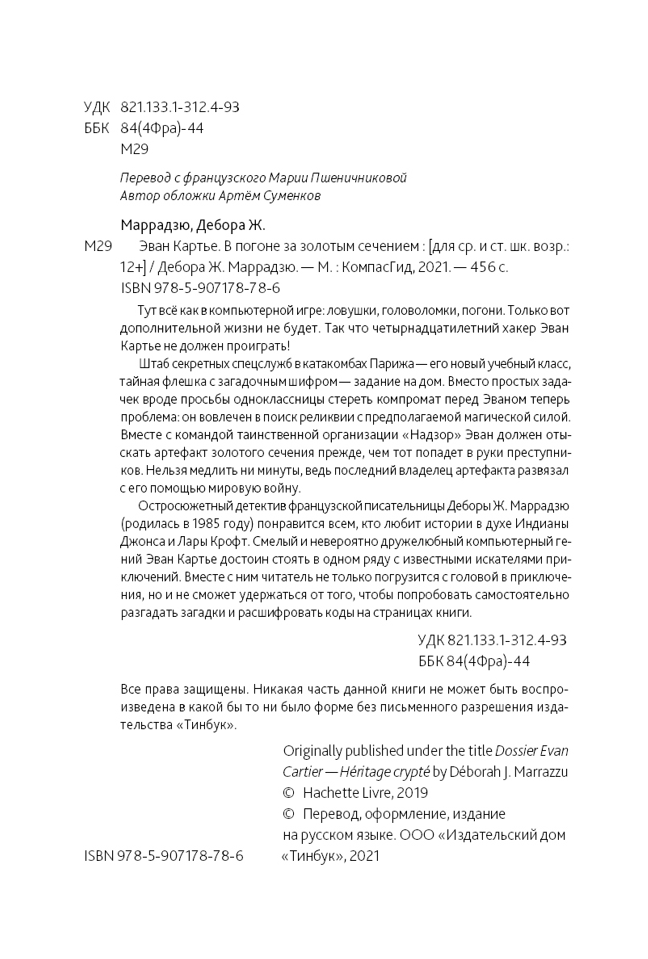 Остросюжетный детектив французской писательницы Деборы Ж. Маррадзю (родилась в 1985 году) понравится всем, кто любит истории в духе Индианы Джонса и Лары Крофт. Смелый и невероятно дружелюбный компьютерный гений Эван Картье достоин стоять в одном ряду с известными искателями приключений. Вместе с ним читатель не только погрузится с головой в приключения, но и не сможет удержаться от того, чтобы попробовать самостоятельно разгадать загадки и расшифровать коды на страницах