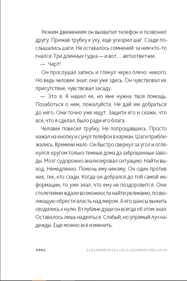 Мастерски закрученный сюжет, где на каждом шагу — погони, шифры, смертельная опасность и загадки. Сюжет невероятно динамичный и увлекательный, в нем удачно переплетены сразу несколько жанров: приключения, детектив, триллер и даже фантастика. ️
