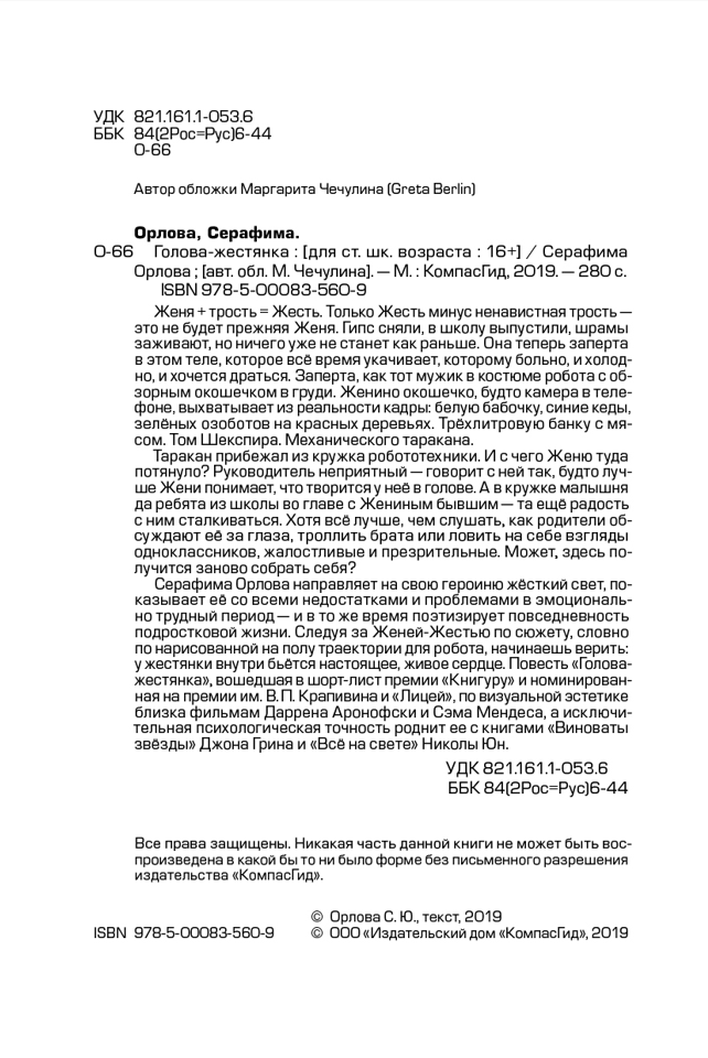 Быть подростком — отстой. Быть девочкой-подростком — ещё горче, потому что уровень давления куда больше, чем на пацанов. Все кругом точно знают, как ты должна себя вести, и этот шаблон незамысловат, скучен и сер (или розов?), но если ты из него выбьешься, то получишь на орехи. В современной литературе очень не хватает текстов для подростков, которые бы показали именно девочкам, что в этот неприятный потерянный период есть куда идти и к чему стремиться, мир на самом не против тебя, а просто закоснел, и обязательно встретятся люди, с которыми будет по пути. Правильно пишет знаток подростков Эдуард Веркин в предисловии к «Голове-жестянке»: «Катишься куда-то, шарахаешься из стороны в сторону, наступаешь на грабли, бьёшься лбом о встречные столбы, звереешь понемногу». Голова жестяная при этом звенит и гудит, некуда деться. Отличная лёгкая книжка Серафимы Орловой про непростые вещи, которые трудно описать в нескольких предложениях.
