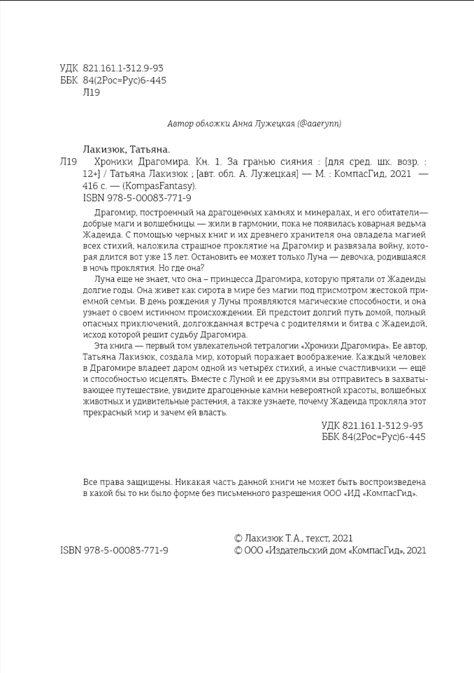Эта книга — первый том увлекательной тетралогии «Хроники Драгомира». Ее автор, Татьяна Лакизюк, создала мир, который поражает воображение. Каждый человек в Драгомире владеет даром одной из четырёх стихий, а иные счастливчики — ещё и способностью исцелять. Вместе с Луной и ее друзьями вы отправитесь в захватывающее путешествие, увидите драгоценные камни невероятной красоты, волшебных животных и удивительные растения, а также узнаете, почему Жадеида прокляла этот прекрасный мир и зачем ей власть.