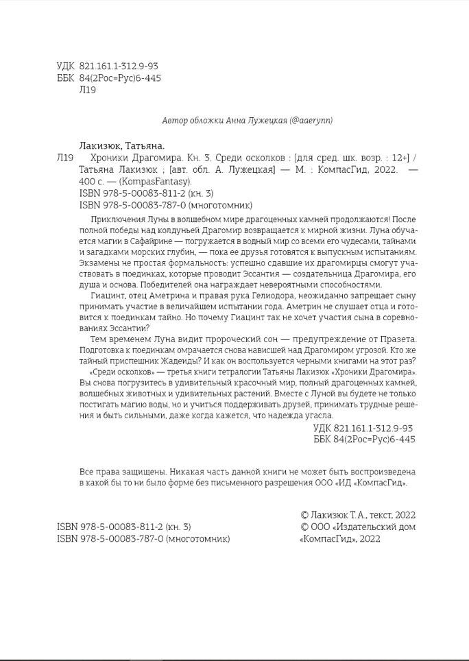 «Среди осколков» — третья книги тетралогии Татьяны Лакизюк «Хроники Драгомира». Вы снова погрузитесь в удивительный красочный мир, полный драгоценных камней, волшебных животных и удивительных растений. Вместе с Луной вы будете не только постигать магию воды, но и учиться поддерживать друзей, принимать трудные решения и быть сильными, даже когда кажется, что надежда угасла.