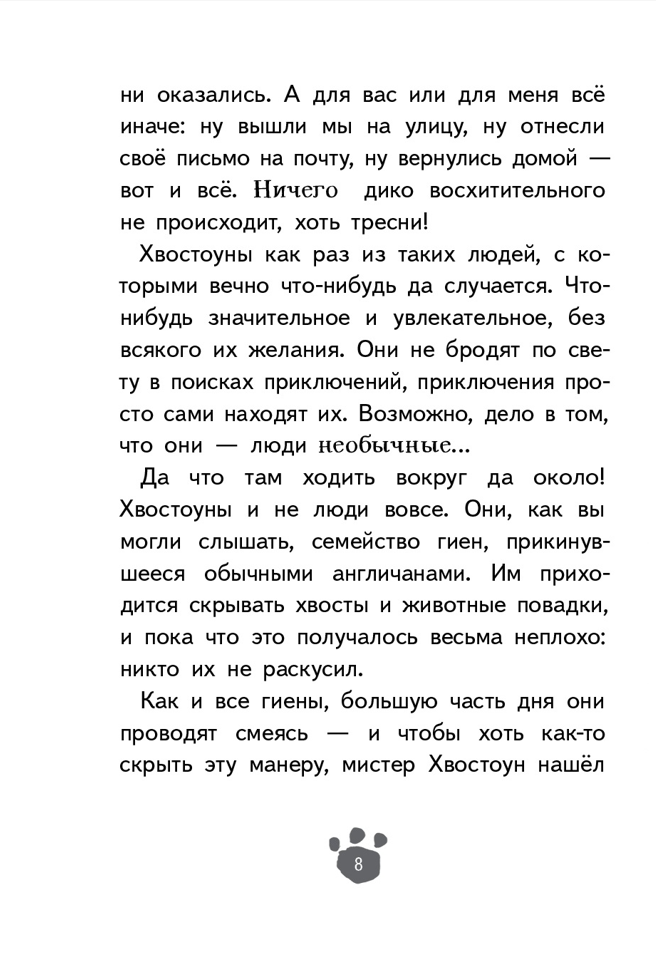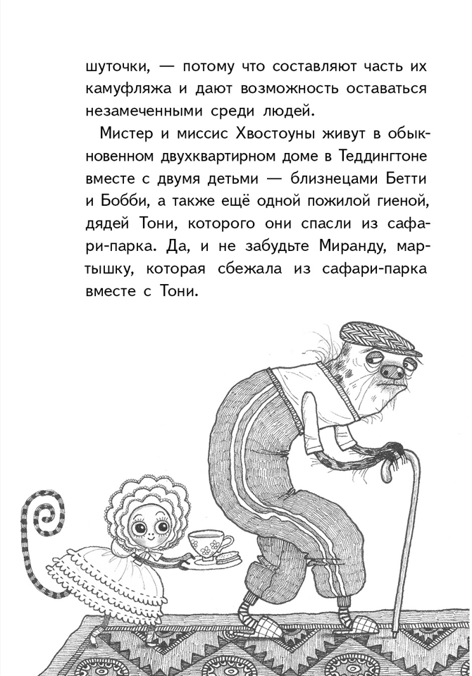 Хвостоуны – необычная семья. Они всё время смеются, никогда не снимают головные уборы, а еще подозрительно напоминают каких-то зверей. И это действительно не люди, а настоящие гиены, приехавшие из Африки в Англию по чужим паспортам! Постепенно они приспособились ходить на двух лапах, одеваться как люди (очень важно хорошенько прятать хвосты!) и даже нашли работу! Оказывается, в городке Теддингтоне под видом людей живет немало диких животных – и одинокий старичок медведь гризли, и пара жирафов, расставляющих товары в супермаркете. Хвостоуны отлично распознают зверей – да и мы с вами, если присмотримся, заметим, что кто-то выглядит слегка "быковато", а кто-то и вовсе «совино».