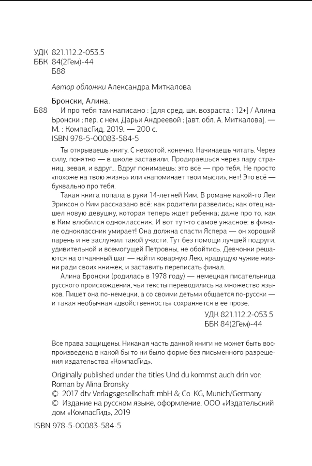 Подростковые романы Алины Бронски воспроизводят живой внутренний мир героев, все их сомнения, метания и противоречивые желания. Но при этом они тщательно сберегают детали социальные: «И про тебя там написано» — произведение современное, и никогда раньше оно написано быть не могло. А если кто-то подумает, что книга эта и про него тоже, — Ким и Петровна подскажут, что делать. (Шутка!)