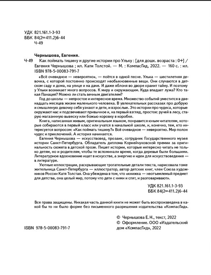 Мне кажется, что написать детскую книгу, в которой рассказывается о жизни обычного ребенка, о его радостях и печалях, ежедневных открытиях, встречах, знакомствах написать гораздо сложнее, чем остросюжетную повесть. Ведь в приключенческом или детективном романе возможно преувеличение, какая-то неточность – все простительно. А здесь необходима предельная степень искренности, любая фальшь видна как на ладони. Почему и немного было писателей уровня Зои Журавлевой с ее «Ожиданием», Эсфирь Цюрупы с «Улицей зелёной» или Софьи Могилевской» с ее «Птицей-синицей». Именно этих авторов я вспоминала, когда читала книгу Евгении Чернышовой «Как поймать тишину и другие истории про Ульку» -- сборник рассказов о маленькой девочке Ульке, которой очень интересно изучать мир и постигать его.
