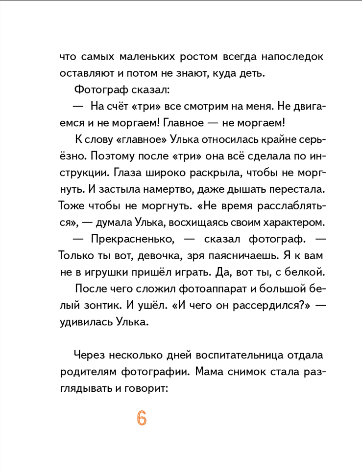 На наших глазах героиня взрослеет, растет. И вот уже в конце книги перед нами Улька-первоклассница. Каким будет ее школьный путь? Хочется верить, что насыщенным и интересным. И очень хочется об этом прочитать! Но тут – как захочет автор! Твердая обложка с частичной лакировкой. Бумага офсет, крупный, четкий, удобный для чтения шрифт. Очень интересные иллюстрации Кати Толстой – выполненные в черно-белой графике с локальным вкраплением ярких цветных акцентов. Это добавляет рисункам объем и эмоционально их насыщает. Рекомендую для чтения всем, кто собирается в первый класс и всем, кто не забыл, как это происходит.