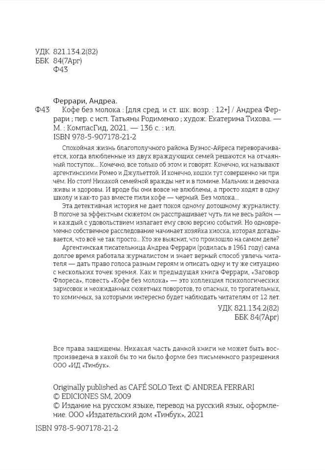 Аргентинская писательница Андреа Феррари (родилась в 1961 году) сама долгое время работала журналистом и знает верный способ увлечь читателя — дать право голоса разным героям и описать одну и ту же ситуацию с нескольких точек зрения. Как и предыдущая книга Феррари, «Заговор Флореса», повесть «Кофе без молока» — это коллекция психологических зарисовок и неожиданных сюжетных поворотов, то опасных, то трогательных, то комичных, за которыми интересно будет наблюдать читателям от 12 лет.