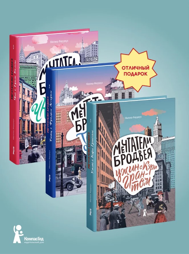 После «Ужина с Кэрри Грантом» и «Танца с Фредом Астером» вышел «Чай с Грейс Келли». Так что если вам близка эстетика послевоенного Нью-Йорка, Бродвея, джаза и кино, «Завтрака у Тиффани» и «Всего этого джаза», вас ждёт 1400 страниц чистого удовольствия. Истории людей, мечтающих о славе – актёрской, танцевальной, модельной. Атмосфера послевоенного мира, кажется, таит в себе безграничные возможности. А ещё – диалоги, множество диалогов и минимум описаний, романы Малики Ферджух – это практически пьесы, в которых ничего не «объясняется», а всё происходит прямо на глазах у изумлённой публики. Главное – успеть, не выпасть из вихря событий и впечатлений. В первом романе один из главных героев – семнадцатилетний Джослин – приезжает в Нью-Йорк и случайно оказывается в женском пансионе «Джибуле», где его окружают яркие и взбалмошные девушки, мечтающие о счастье. Эти романы полны аллюзий на золотую классику голливудского кинематографа, а названия глав – песни того времени, позволяющие включить дополнительные органы чувств при чтении. Герои – старшие подростки или совсем молодые люди, которые уже живут отдельно от семей и сами зарабатывают себе на жизнь, не предавая мечту, и потому «Мечтатели Бродвея» – это ещё и романы воспитания. Путь героев не будет простым: пианист Джослин вынужден работать лифтёром, танцовщица Манхэттен – ассистенткой по костюмам, актриса Пейдж играет в радиоспектакле и остаётся невидимкой, а Грейс Келли, головокружительная карьера которой ещё на самом старте, может только мечтать о независимости. С первого раза получится не у всех, но недаром Нью-Йорк – это город возможностей.
