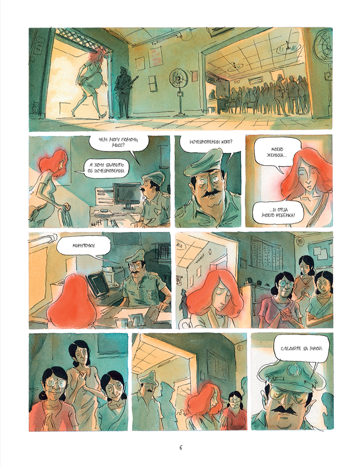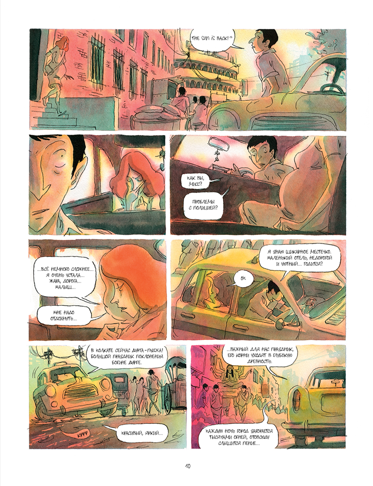 Я думала, что этот графический роман — просто история про яркую, колоритную я контрастную Индию. Оказалось, что это мало того, что детективы так ещё и история о глобальных проблемах. Удивляться я начала ещё с момента знакомства с главной героиней. Аделаида — беременная женщина, которая прилетела из Франции в Индию, чтобы найти пропавшего мужа. На последних сроках беременности она носилась по городу, где многие были настроены к ней враждебно. И ведь кажется, что в Калькутту её привела любовь, но оказывается не все так просто и романтично. Но главная проблема здесь — вода. Обычная вода для питья, орошения растений, жизни. Целый Бангладеш мог пострадать из-за действий одной корпорации. Я мало что знаю о политике Индии, но, думаю, описанная ситуация вполне могла бы быть в реальности. Только в реальности нашелся бы такой смельчак, который рискнул бы жизнью ради спасения людей? Конечно, я ожидала, что книга будет более детская. Но в ней есть и откровенные и жестокие сцены. Например, сон Аделаиды. Образы, которые встретились ей во время индийского праздника, переживания за себя, мужа, ещё нерожденного ребенка, встретились в её кошмаре. Необычная история с очень закрученным сюжетом — я ни разу не догадалась, что будет ждать меня на следующей странице.
