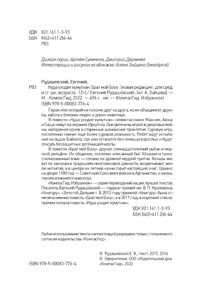«КомпасГид. Избранное» — серия переизданий наших лучших текстов. Писатель Евгений Рудашевский — лауреат премий им. В. П. Крапивина, «Книгуру», «Золотой Дельвиг». В 2013 году премией «Книгуру» была отмечена именно повесть «Брат мой Бзоу», а в 2017 году в короткий список премии попала повесть «Куда уходит кумуткан».