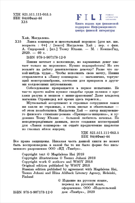 Жутковатый ассортимент и странные сотрудники лавки ни капли не страшные, а очень милые и обаятельные - об этом позаботились Магдалена Хай - автор нашумевшего финского стимпанк-романа "Принцесса-нищенка", и художник Теэму Юхани - большой любитель печенья. По неподтверждённым данным, после создания иллюстраций для "Лавки кошмаров" он отдаёт предпочтение шарлотке из глазных яблок ящериц.