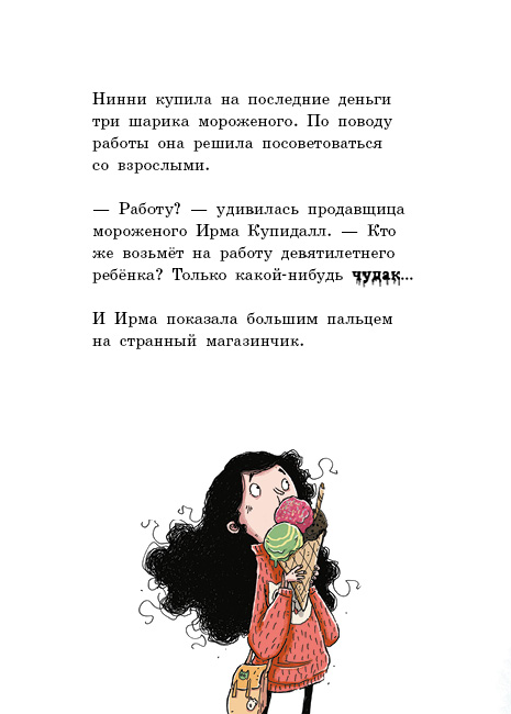 Нинни мечтает о велосипеде, но карманных денег хватает только на мороженое. Что же делать? Правильно! Нужно подзаработать! Но кто возьмёт на работу девятилетнюю девочку? Разве что какой-нибудь чудак… Нинни попадает в "Лавку кошмаров", магазин торгующий разными колдовскими штуковинами. И собеседование превращается в первое испытание. Не так-то просто найти нужное снадобье среди склянок с крохами разума и мешков с мини-драконами! Даже владелец магазина Страннодед всё время здесь теряется… ⠀ Мое мнение: ⠀ Мне очень понравилась эта малютка! Оформление просто волшебное, оторвать взгляд просто невозможно! Но малюсенький минус есть. Мне не хватило 60 страниц!!! Но как я поняла, это только первая часть. Так что жду с нетерпением остальные.