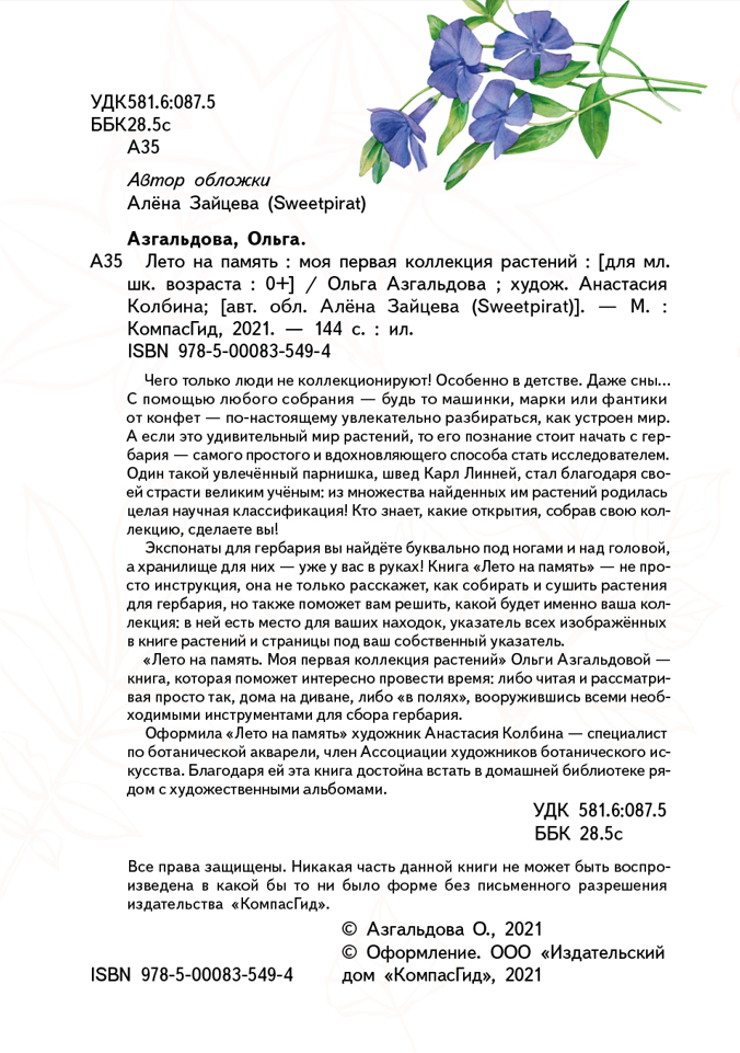 «Лето на память. Моя первая коллекция растений» Ольги Азгальдовой ― книга, которая поможет интересно провести время: либо читая и рассматривая просто так, дома на диване, либо «в полях», вооружившись всеми необходимыми инструментами для сбора гербария.