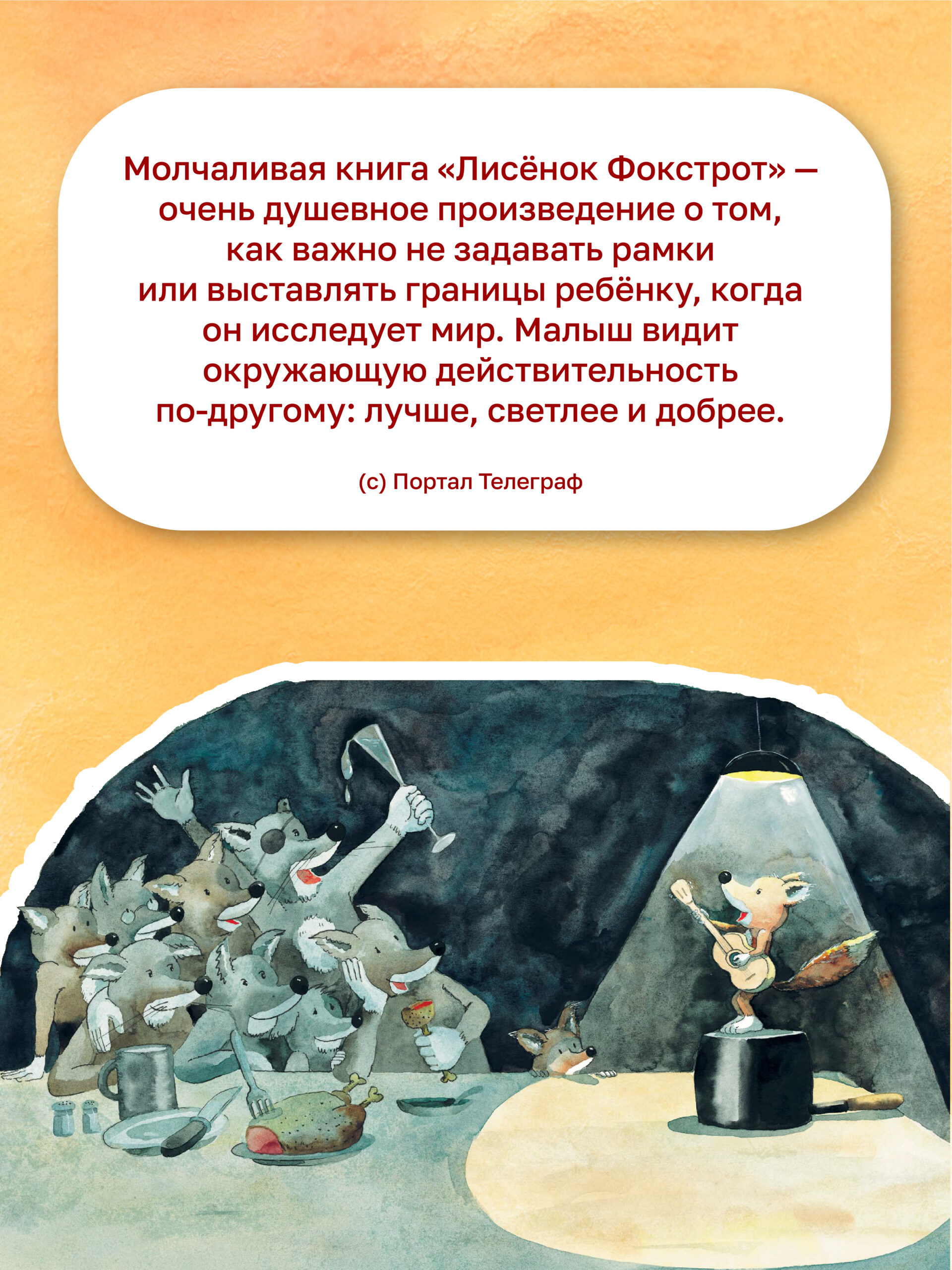 Жила-была одна обычная лисья семья. Жили они тихо, спокойно и неприметно, как и полагается всем лисам. Пока однажды у них не появился лисёнок — Фокстрот. Он подрос, выбрался из тёмной норы и открыл для себя, что весь мир наполнен звуками: жужжанием, гудением, стрекотанием, кваканьем, гоготанием, кукареканьем, чириканьем, свистом, карканьем, бренчанием и мычанием!.. Немудрено, что после такого открытия он непременно станет самым известным певцом среди зверей.