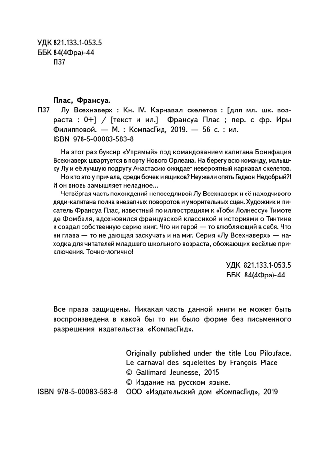 Четвёртая часть похождений непоседливой Лу Всехнаверх и её находчивого дяди-капитана полна внезапных поворотов и уморительных сцен. Художник и писатель Франсуа Плас, известный по иллюстрациям к «Тоби Лолнессу» Тимоте де Фомбеля, вдохновился французской классикой и историями о Тинтине и создал собственную серию книг. Что ни герой — то влюбляющий в себя. Что ни глава — то не дающая заскучать и на миг. Серия «Лу Всехнаверх» — находка для читателей младшего школьного возраста, обожающих весёлые приключения. Точно-логично!