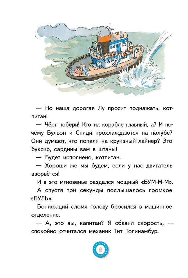 Классная серия книг про крошку кошку Лу, которая путешествует на буксире "Упрямый" вместе со своим дядей Бонифацием Всехнаверх и лучшей подругой Анастасией (она скелет, не удивляйтесь). У команды буксира имена еще забавнее - радист МегаГерц, кок Бульон Дюжур, матрос Спиди Рейсер, ну вы поняли. Вообще самое классное в книге это язык. Все уже сто раз написали про ругательства Капитана Бонифация, и я напишу в стопервый. Они чудесные! "Общипанная утка мне в бок!", "Трусы кашалота вам на голову", "Ах ты сом без усов", "Да чтоб тобой позавтракала пиранья", - ну это же огонь?!?! Читаешь и смеешься без остановки. Сюжет книг довольно прост - это приключенческая проза. Кто-то что-то украл или потерял и нужно срочно всем помочь. Естественно, наши герои всех победят, и при этом посрамят злодеев, главный из которых противный носорог Гедеон Недобрый, этакий Мистер Зло. И по пути будет много всего смешного, автор не побоится писать про какашки, оставлять гереов в трусах и ругаться дураками и дырявыми носками направо и налево. Перечитывать дочка не просила, хотя слушала с удовольствием и смеялась в голос. Возможно, мы чуть рановато прочли (почти в 6 лет), может быть ей было бы смешнее прочесть это самой через годик.