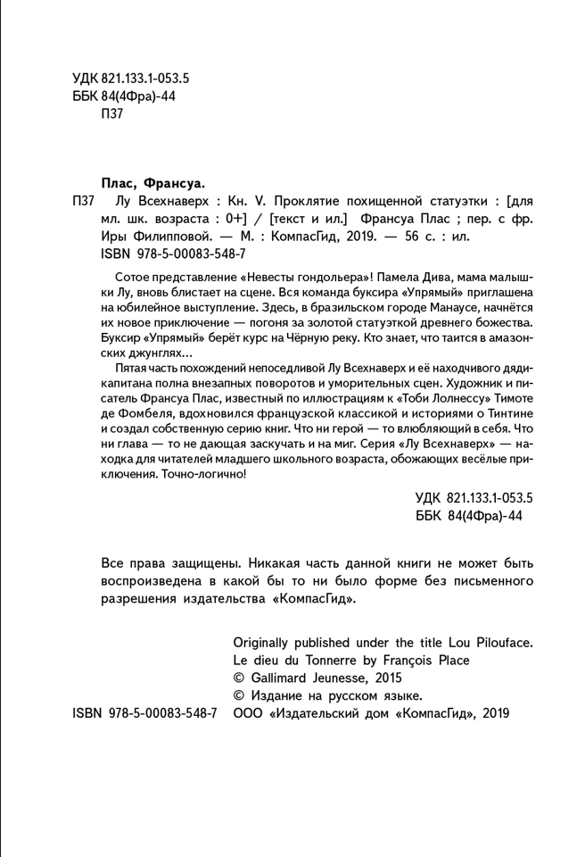 Пятая часть похождений непоседливой Лу Всехнаверх и её находчивого дяди-капитана полна внезапных поворотов и уморительных сцен. Художник и писатель Франсуа Плас, известный по иллюстрациям к «Тоби Лолнессу» Тимоте де Фомбеля, вдохновился французской классикой и историями о Тинтине и создал собственную серию книг. Что ни герой — то влюбляющий в себя. Что ни глава — то не дающая заскучать и на миг. Серия «Лу Всехнаверх» — находка для читателей младшего школьного возраста, обожающих весёлые приключения. Точно-логично!