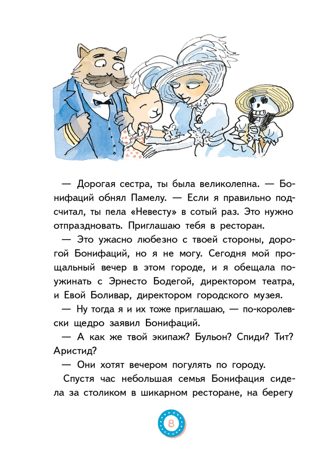 Классная серия книг про крошку кошку Лу, которая путешествует на буксире "Упрямый" вместе со своим дядей Бонифацием Всехнаверх и лучшей подругой Анастасией (она скелет, не удивляйтесь). У команды буксира имена еще забавнее - радист МегаГерц, кок Бульон Дюжур, матрос Спиди Рейсер, ну вы поняли. Вообще самое классное в книге это язык. Все уже сто раз написали про ругательства Капитана Бонифация, и я напишу в стопервый. Они чудесные! "Общипанная утка мне в бок!", "Трусы кашалота вам на голову", "Ах ты сом без усов", "Да чтоб тобой позавтракала пиранья", - ну это же огонь?!?! Читаешь и смеешься без остановки. Сюжет книг довольно прост - это приключенческая проза. Кто-то что-то украл или потерял и нужно срочно всем помочь. Естественно, наши герои всех победят, и при этом посрамят злодеев, главный из которых противный носорог Гедеон Недобрый, этакий Мистер Зло. И по пути будет много всего смешного, автор не побоится писать про какашки, оставлять гереов в трусах и ругаться дураками и дырявыми носками направо и налево. Перечитывать дочка не просила, хотя слушала с удовольствием и смеялась в голос. Возможно, мы чуть рановато прочли (почти в 6 лет), может быть ей было бы смешнее прочесть это самой через годик.