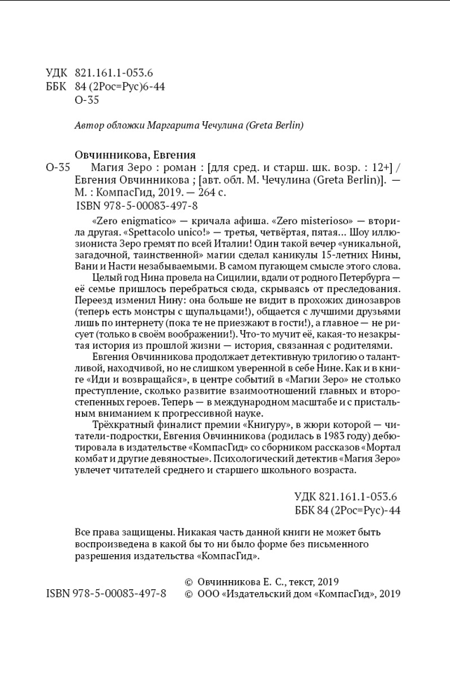 Евгения Овчинникова продолжает детективную трилогию о талантливой, находчивой, но не слишком уверенной в себе Нине. Как и в книге «Иди и возвращайся», в центре событий в «Магии Зеро» не столько преступление, сколько развитие взаимоотношений главных и второстепенных героев. Теперь — в международном масштабе и с пристальным вниманием к прогрессивной науке.
