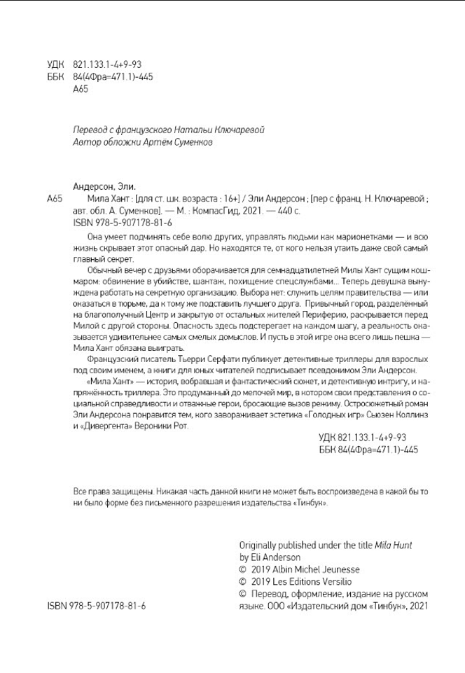 Французский писатель Тьерри Серфати публикует детективные триллеры для взрослых под своим именем, а книги для юных читателей подписывает псевдонимом Эли Андерсон. «Мила Хант» — история, вобравшая и фантастический сюжет, и детективную интригу, и напряжённость триллера. Это продуманный до мелочей мир, в котором свои представления о социальной справедливости и отважные герои, бросающие вызов режиму. Остросюжетный роман Эли Андерсона понравится тем, кого завораживает эстетика «Голодных игр» Сьюзен Коллинз и «Дивергента» Вероники Рот.