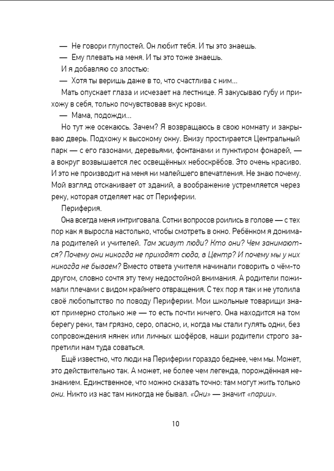 Сразу скажу, что это одна из самых жестоких книг Компаса (страшней и жёстче только «Город без войны» Пономаренко и «Скажи, Красная Шапочка» - но это из другой серии). А ещё - самая утопичная книга. А ещё самая странно - утопичная книга. Не много ли слова «самая»?!Про сюжет. Начинается стандартно, как в любой антиутопии - есть место, страна, город, поделённые на два - богатые живут за чертой, в центре и хорошо живут, бедные - маргиналы за чертой/стеной. Изредка устраивают свои маленькие революции, пока не придёт Некто. Тут есть Демос и Периферия. Мила Хант, обычный (вру!) подросток - ночные клубы, неповиновение родителям, горячо любимый младший брат и друзья. И тайный дар - подчинять волю других. И вот она уже на Периферии засланным казачком от людей Демоса, заставили. И дальше уже все пойдёт не по сценарию. Как вам - дети и подростки имеют право голоса, более того, заправляют всеми делами? По какой дорожке пойдёт развитие и история? А между тем Милу приняли в кокон, она теперь с ними..Мммм, я бы могла вам сказать, что тут отсылки к Дивергенту, Бегущему в лабиринте, Ханне, Аните, Люди Х и даже к Повелителю мух и другим антиутопиям. Но.. но тут получилась другая история, цельная, может быть излишне жестокая( 16+), но классная.. и я бы это посмотрела на экране! Потому что примерно за середину книги - сюжет бьет по всем канонам!!Удивлена и покорена. Компасгид- В копилку необычных антиутопий.
