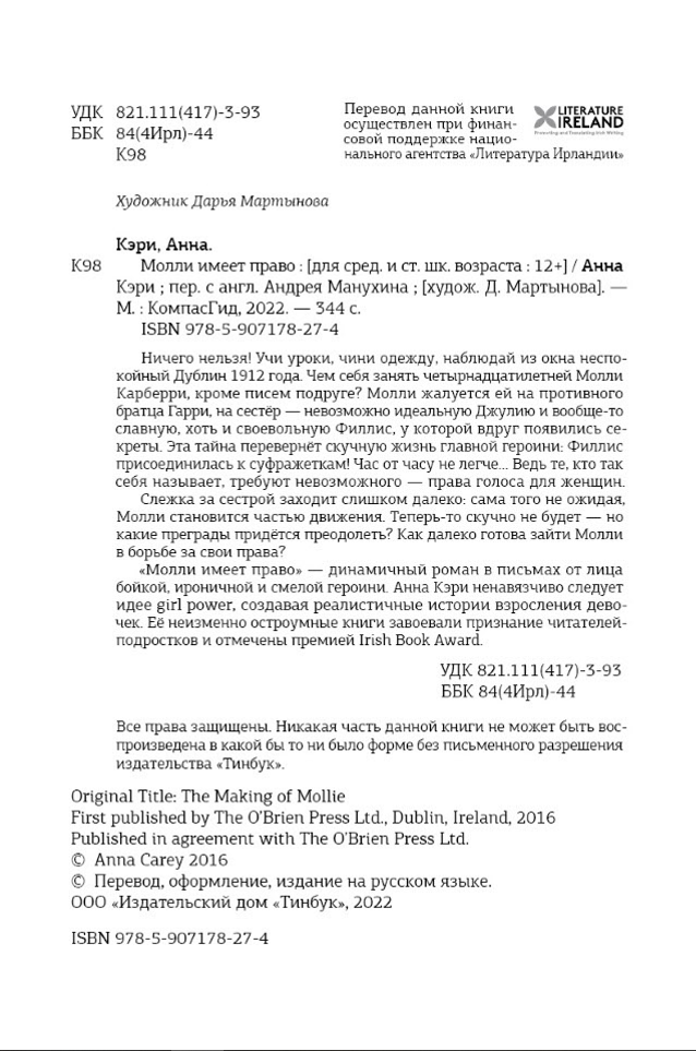 «Молли имеет право» — динамичный роман в письмах от лица бойкой, ироничной и смелой героини. Анна Кэри ненавязчиво следует идее girl power, создавая реалистичные истории взросления девочек. Её неизменно остроумные книги завоевали признание читателей подростков и отмечены премией Irish Book Award.