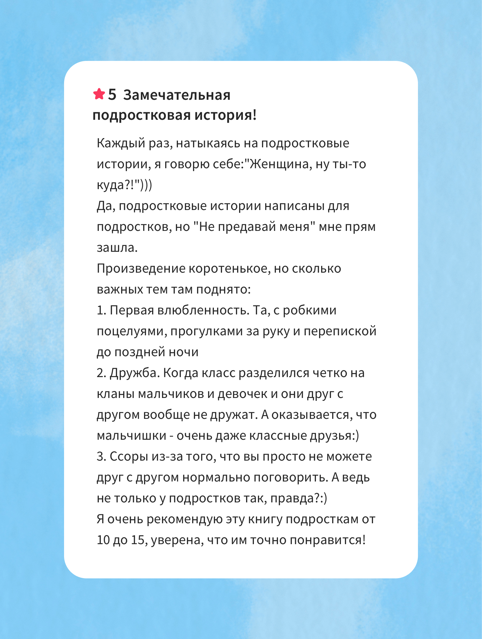 Повесть «Не предавай меня» рассказывает об актуальных проблемах подростков: о взаимоотношениях со сверстниками, родителями и учителями, первой любви, проблемах признания в коллективе. Главная героиня книги – это Юля Озарёнок, казалось бы, самая обычная девочка, но внезапно она оказывается аутсайдером, после чего и начинаются все её неприятности. Но как оказалось, всё ещё не так плохо, и все проблемы всегда можно решить, если хорошо постараться. Каково осознать, что ты изгой в своём классе, как дальше с этим бороться и изменить ситуацию? Для тех, кому близка данная тема, будет наиболее интересно читать эту книгу, ведь в главных героях они смогут узнать самих себя. И, возможно, решение проблемы в Юлиной истории сможет помочь и в вашей личной истории. Читая книгу, я сопереживала главной героине Юле, понимая её переживания. Поэтому я считаю, что это очень жизненная и близкая многим подросткам история.