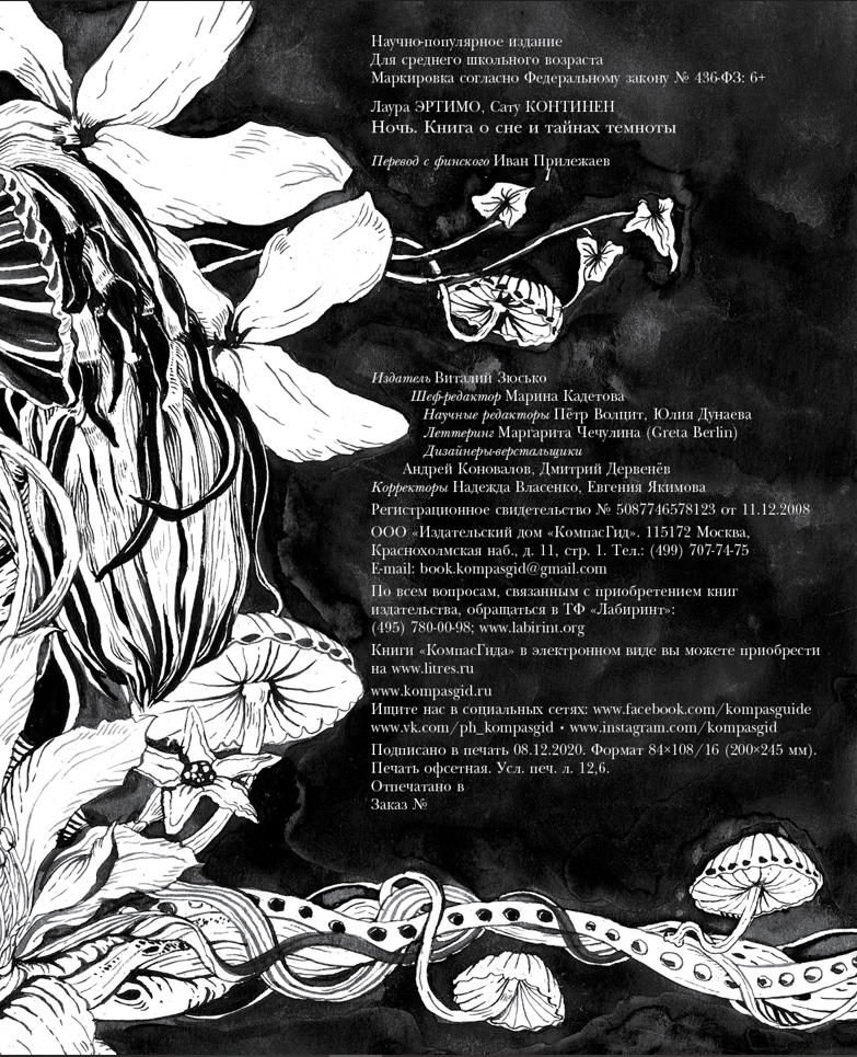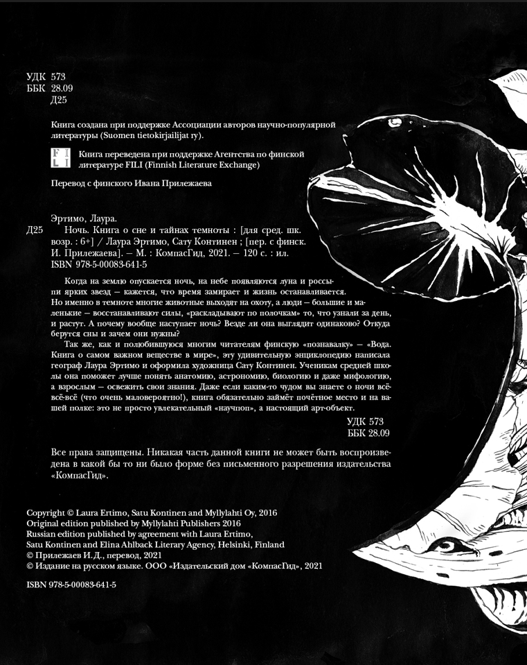 Когда на землю опускается ночь, на небе появляются луна и россыпи ярких звезд - кажется, что время замирает и жизнь останавливается. Но именно в темноте многие животные выходят на охоту, а люди - большие и маленькие - восстанавливают силы, "раскладывают по полочкам" то, что узнали за день, и растут. А почему вообще наступает ночь? Везде ли она выглядит одинаково? Откуда берутся сны и зачем они нужны? Так же, как и полюбившуюся многим читателям финскую "познавалку" - "Вода. Книга о самом важном веществе в мире", эту удивительную энциклопедию написала географ Лаура Эртимо и оформила художница Сату Континен. Ученикам средней школы она поможет лучше понять анатомию, астрономию, биологию и даже мифологию, а взрослым - освежить свои знания. Даже если каким-то чудом вы знаете о ночи всё-всё-всё (что очень маловероятно!), книга обязательно займёт почётное место и на вашей полке: это не просто увлекательный "научпоп", а настоящий арт-объект.