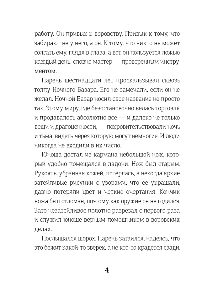 Каз — единственный человек в Ночном Базаре — поселился в этом загадочном волшебном мире, когда его спас могущественный демон Холд. Парень промышляет воровством, умеет лгать, и оба эти таланта не раз его выручали. Каз чувствует себя здесь как дома — пока не происходит то, к чему он точно не был готов. На улицах появляется другой человек — девушка по имени Али. Как она попала сюда? Где ее семья? И почему Холд так отчаянно просит найти старый золотой медальон?