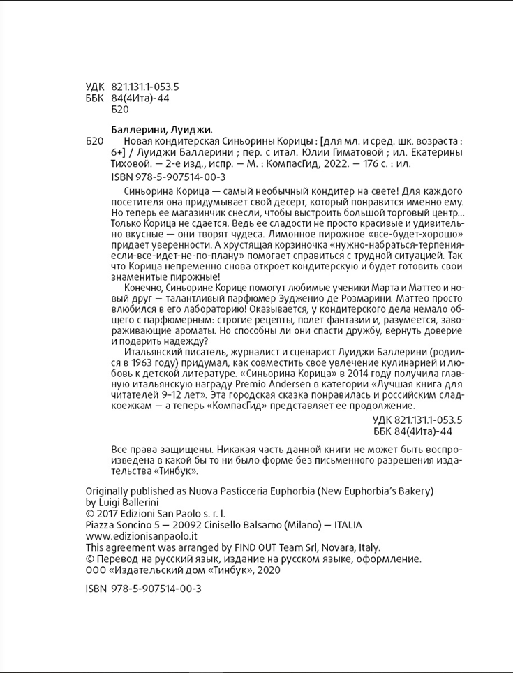Итальянский писатель, поэт, литературный критик и переводчик Луиджи Баллерини (родился в 1940 году) — большой ценитель кулинарии: под его редакцией вышло несколько энциклопедий, посвящённых этому искусству. Увлечение Баллерини пересеклось в «Синьорине Корице» с любовью к детской литературе — и успешно: повесть была отмечена главной итальянской молодёжной наградой, Premio Andersen, в 2014 году. На родине писателя эта городская сказка для 8–11-летних сразу приобрела популярность: светлая, добрая и запоминающаяся история — настоящая современная классика.