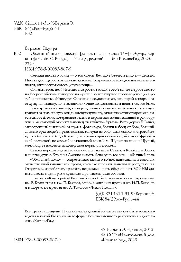 «Облачный полк» — современная книга о войне, написанная в канонах отечественной юношеской прозы, но смело через эти каноны переступающая. Отсутствие «геройства», простота, недосказанность, обыденность ВОЙНЫ ставят повесть в один ряд с лучшими произведениями ХХ века.