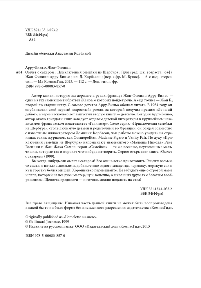 Автор книги, которую вы держите в руках, француз Жан-Филипп Арру-Виньо — один из тех самых шести братьев Жанов, о которых пойдет речь. А еще точнее — Жан Б., второй по старшинству. С самого детства Арру-Виньо обожал читать. В 1984 году он опубликовал свой первый «взрослый» роман, за который получил премию «Лучший дебют», а через несколько лет выпустил вторую книгу — детскую. Сегодня Арру-Виньо, автор около тридцати книг, заведует отделом детской литературы в крупнейшем независимом французском издательстве «Галлимар». Свою серию «Приключения семейки из Шербура», столь любимую детьми и родителями во Франции, он создал совместно с известным иллюстратором Доминик Корбасон, чьи работы можно увидеть на страницах таких журналов, как Cosmopolitan, Madame Figaro и Vanity Fair. По духу «Приключения семейки из Шербура» напоминают знаменитого «Малыша Николя» Рене Госинни и Жан-Жака Сампэ: герои «Семейки» — те же веселые, неугомонные мальчишки, которые так и норовят что-нибудь натворить. Серию открывает книга «Омлет с сахаром» (1999).