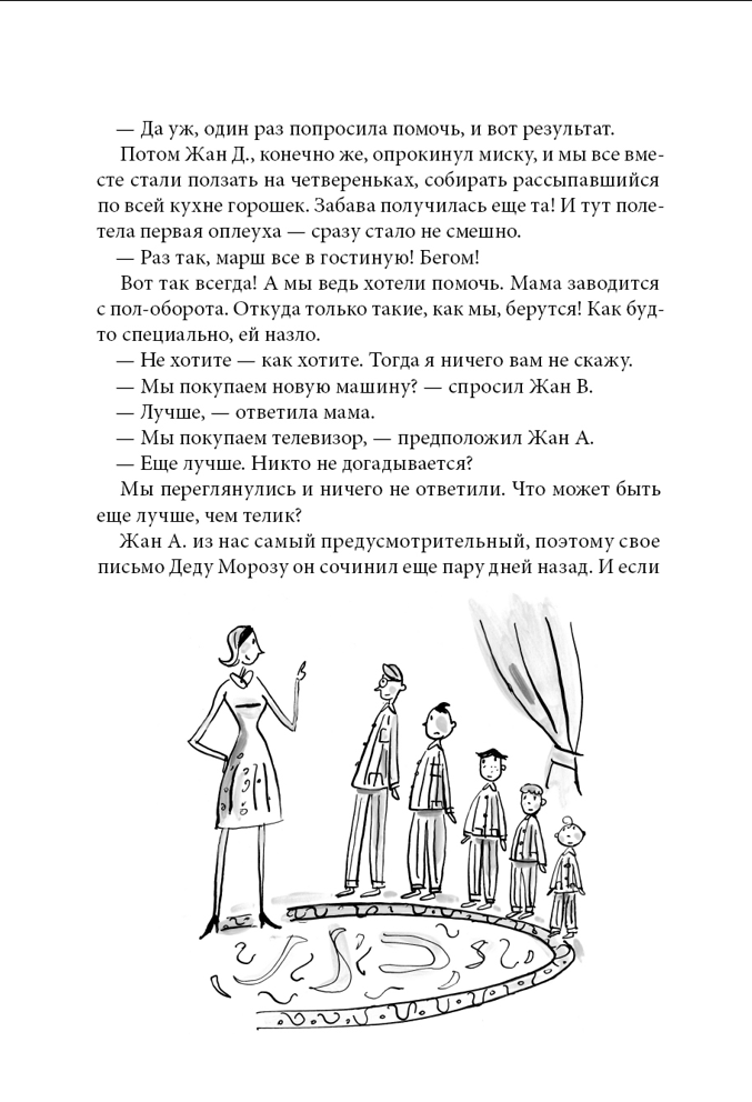 «Это всё ваши дети? — Нет, мы просто усыновили детский лагерь» Это небольшое, но очень забавное произведение напомнило мне отечественные «Денискины рассказы»: невозможно читать без улыбки про бесконечную череду проделок и передряг, в которые попадают герой— рассказчик Жан Б., его братья и даже отец (к слову, самый комичный персонаж).