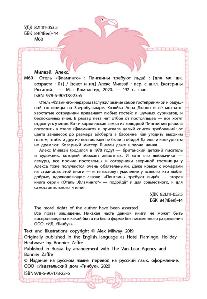 Отель "Фламинго" недаром заслужил звание самой гостеприимной и радушной гостиницы на Зверобульваре. Хозяйка Анна Дюпон и её мохнато-хвостатые сотрудники привечают любых гостей: и шумных сурикатов, и беспокойных пчёл. В разгар лета нет отбоя от постояльцев - все хотят отдохнуть у моря. Вот и королевская семья из холодной Пингвинии решила погостить в отеле "Фламинго" и прислала целый список требований: от цвета занавесок до размера айсберга в бассейне. Как угодить высоким гостям, чтобы и другие постояльцы не были в обиде? Да ещё и конкуренты не дремлют. Коварный мистер Львиан даже шпиона нанял...