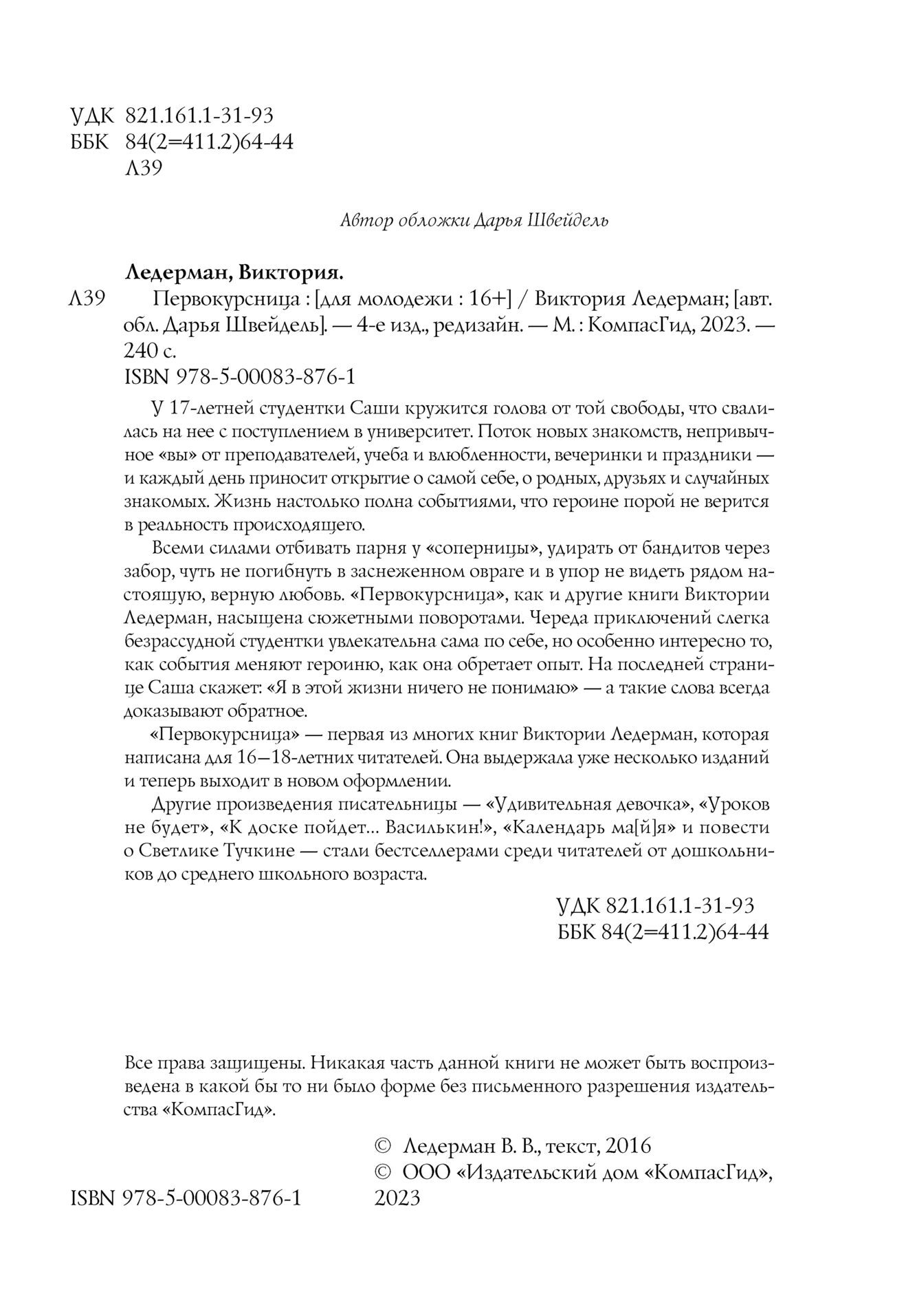 «Первокурсница» — первая из многих книг Виктории Ледерман, которая написана для 16–18-летних читателей. Она выдержала уже несколько изданий и теперь выходит в новом оформлении.