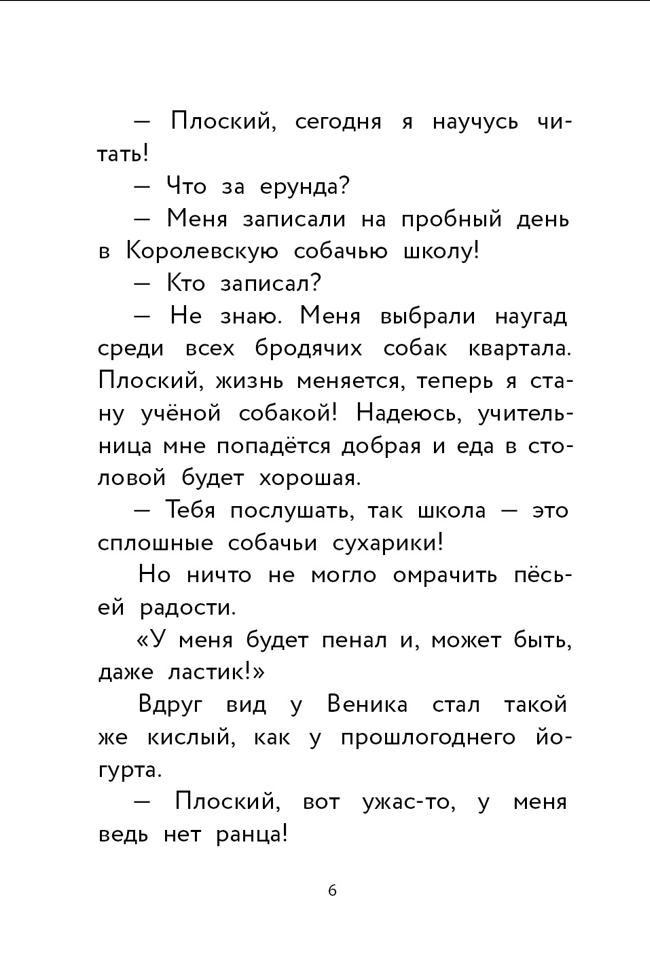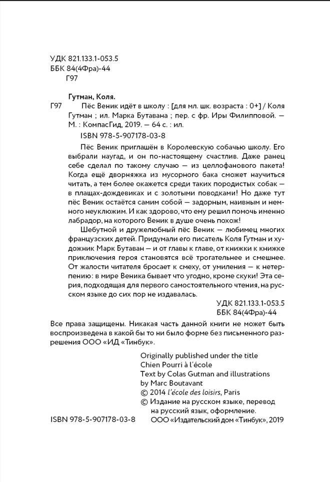 Новая французская серия для читателей младшего школьного возраста посвящена милому, доброму и наивному псу по кличке Веник. Издательство «КомпасГид» рекомендует эти книги в качестве первого самостоятельного чтения — а также тем, кто уже полюбил «Детектива Флетчера» и «Лу Всехнаверх». Пёс Веник — обыкновенная собака из мусорного бака. Бродяга, никогда не имевший крыши над головой, и даже не знающий толком, кто такой «хозяин» и каково быть домашним псом. Но его смутно манит в тишину и тепло человеческого жилища — а потому однажды он решает во что бы то ни стало отыскать себе хозяина. Хоть какого-нибудь! Это становится началом целой череды приключений, как радостных, так и грустных. Истории о Венике всегда одновременно весёлые и выбивающие слезу: бедолагу главного героя жалко, как бывает жалко мультяшного героя, словно магнитом притягивающего неприятности. Но в этой своей неловкости Веник особенно очарователен — и он моментально влюбляет в себя всякого читателя, которому нравятся истории о животных. Чтение серии книг французского писателя Коля Гутмана — эдакая тренировка сопереживания: если уж развивать в ребёнке эмпатию, то именно с такими персонажами!
