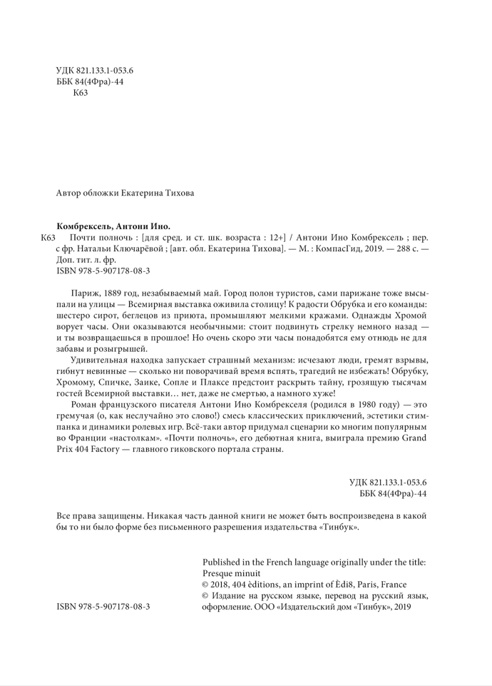 Роман французского писателя Антони Ино Комбрекселя (родился в 1980 году) — это гремучая (о, как неслучайно это слово!) смесь классических приключений, эстетики стимпанка и динамики ролевых игр. Всё-таки автор придумал сценарии ко многим популярным во Франции «настолкам». «Почти полночь», его дебютная книга, выиграла премию Grand Prix 404 Factory — главного гиковского портала страны.