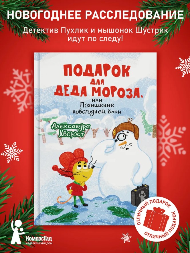 Отличный вариант для детей, которые только начинают читать. Это новогодний детектив с простым, но увлекательным сюжетом: в канун Нового года из леса пропадает главная елка, праздник без нее не состоится, а значит, помощникам Деда Мороза — снеговику Пухлику и мышонку Шустрику — придется ее отыскать.
