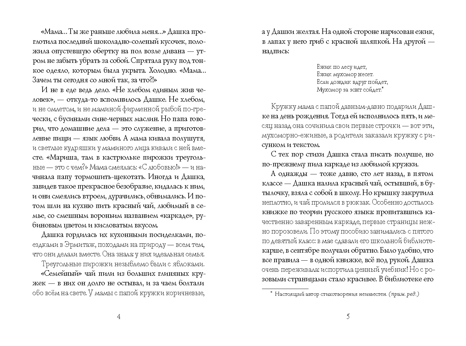 В повести показана типичная жизнь современного подростка, с радостями, разочарованиями, тревогами, первой любовью, ревностью, с познанием своих возможностей. И первой серьезной утратой. После основного текста – подборка Дашиных стихов, отражающих ее душевные поиски, зеркало внутреннего мира подростка.