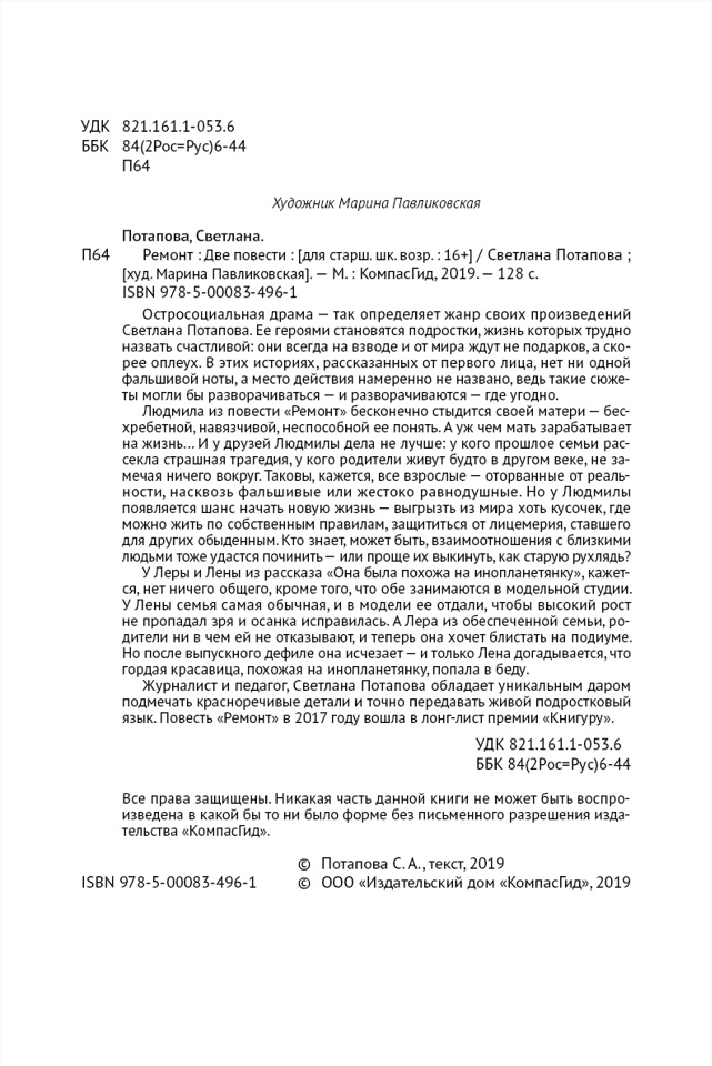 Журналист и педагог, Светлана Потапова обладает уникальным даром подмечать красноречивые детали и точно передавать живой подростковый язык. Повесть «Ремонт» в 2017 году вошла в лонг-лист премии «Книгуру».