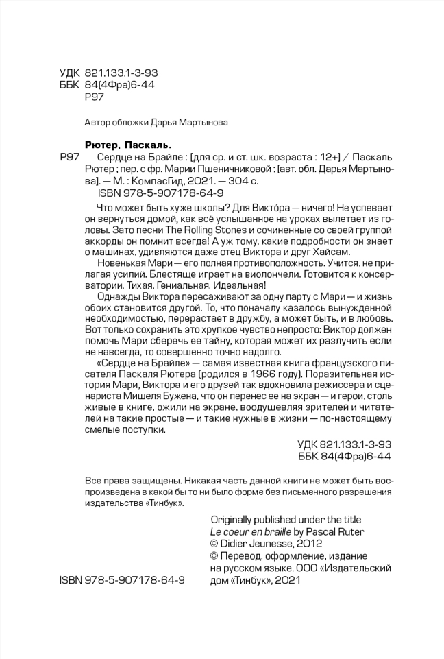 "Сердце на Брайле" - самая известная книга французского писателя Паскаля Рютера (родился в 1966 году). Поразительная история Мари, Виктора и его друзей так вдохновила режиссера и сценариста Мишеля Бужена, что он создал на ее основе фильм - и герои, столь живые в книге, ожили на экране, воодушевляя зрителей и читателей на такие простые - и такие нужные в жизни, - по-настоящему смелые поступки.